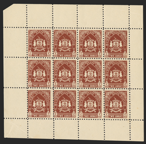 £110.00| /Indian Feudatory States Bundi 1941-44 'Coat of Arms' 2a chestnut, complete sheet of 12 (4x3), SG82. A very fine unmounted mint complete sheet with ...