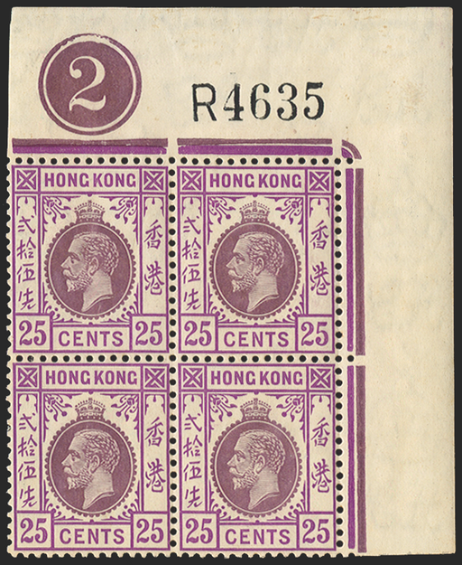 £275.00| /Hong Kong 1921-37 25c purple and magenta, Script watermark, upper right corner block of 4 showing plate number '2' and 'R4635' requisition number, ...