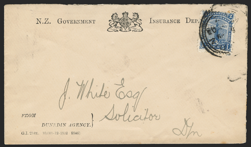 £125.00| /New Zealand Life Insurance 1903 (22 ?P) Official printed envelope (G.I. 284K. 10,000-12-1902 9346, 'FROM DUNEDIN AGENCY' printing, unrecorded by Br...