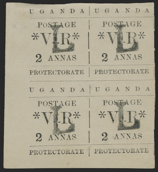 £850.00| /Uganda 1896 (7 Nov) Typeset 2a black on thick white wove, handstamped 'L' (type 7) for local use, lower left corner block of 4, showing variety 'Sm...
