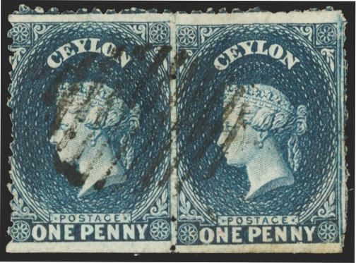 £950.00| /Ceylon 1857-64 ½d reddish lilac on blue glazed paper, imperforate horizontal pair, SG16. Fine used pair with large margins, neatly cancelled by bar...
