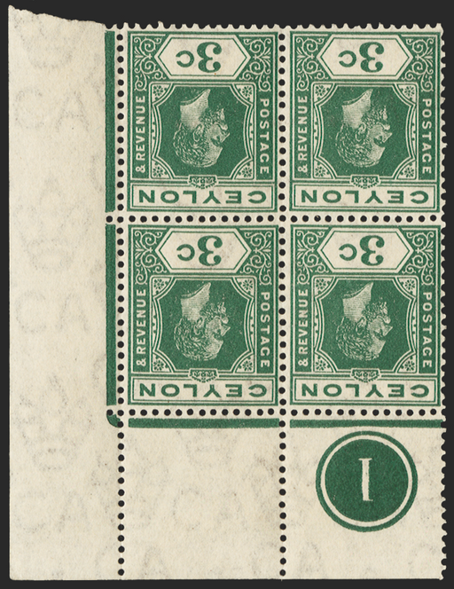 £110.00| /Ceylon 1912-25 watermark MCA 3c blue-green (tablet type A), upper right corner block of 4 with plate number '1', with variety watermark INVERTED, S...