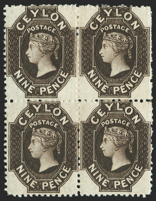 £550.00| /Ceylon 1867-70 9d blackish brown, watermark CC, (type 6), block of 4 with intense colour, SG69b. A fine mint block with original gum. One stamp wit...