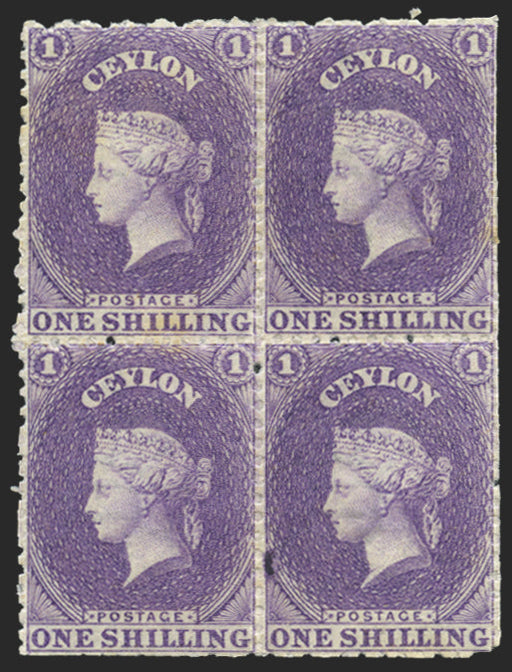 £950.00| /Ceylon 1867-70 1s reddish violet, watermark CC type 6,SG71b. A fine mint block of 4 with virtually full original gum. Separated by scissors (lower ...