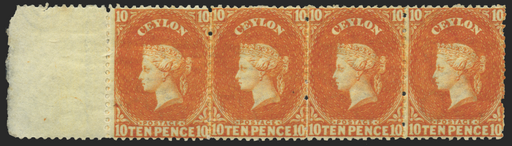 £550.00| /£550.00 Ceylon 1867-70 10d red-orange, watermark CC type 6, horizontal strip of 4 from left of sheet, SG70b. Brilliant quality mint strip of four...