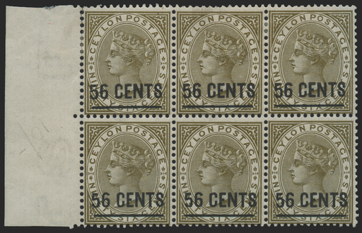 £2,800.00| /Ceylon 1885 56c on 96c drab, De La Rue type 26 surcharge, block of 6 (3x2) from left of sheet, SG192. Fine mint block of six with fresh appearance ...
