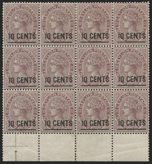 £120.00| /Ceylon 1885 10c on 24c brown-purple, De La Rue type 26 surcharge, lower marginal block of 12 (4x3) with guide cross, SG188. A fine mint block of tw...