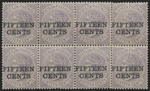 £75.00| /Ceylon 1885 15c on 16c pale violet, local surcharge as type 22, block of 8 (4x2) from position 8-11 of the setting, SG186. A fine mint block of eig...