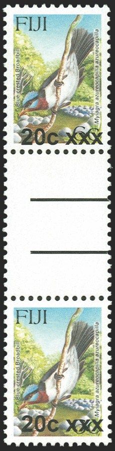 £130.00| /Fiji 2006-08 Local provisional 20c on 6c 'Flycatcher', type IIIb surcharge, vertical interpane pair, SGF1335. A superb unmounted mint pair with ful...
