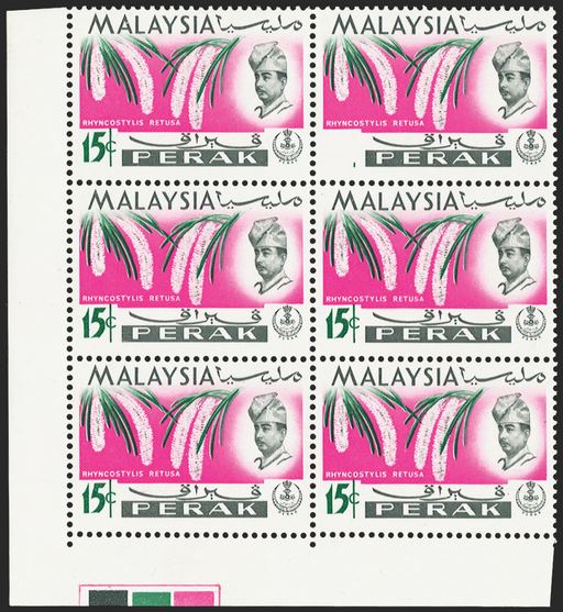 £275.00| /Malaysia - Perak 1965-68 15c 'Orchid', lower left corner block of 6 (2x3) with colour indicators, the upper right stamp showing partial printing of...