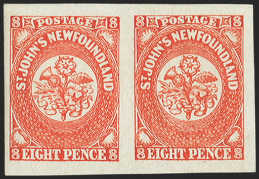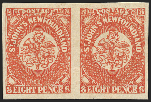 £550.00| /Newfoundland 1857-64 8d scarlet-vermilion 'Royal Crown and Heraldic flowers of the United Kingdom', thick machine-made paper, horizontal pair, SG8....