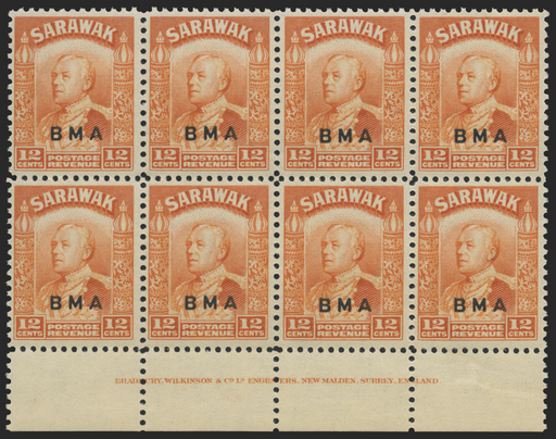 £95.00| /Sarawak 1945 12c orange "BMA", type 22 overprint, lower marginal block of 8 (4x2) with full imprint, clearly showing the junction of the two impres...
