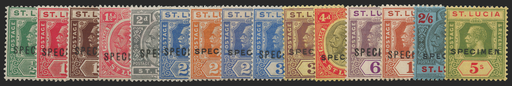 £225.00| /St Lucia 1921-30 set of 15 to 5s, Script watermark overprinted 'SPECIMEN', SG91s/105s. A fine mint set with large part original gum. Odd minor blem...