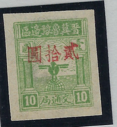 China 1946-47 North China Shaanxi-Hebei-Shandong-Henan Border Area $20 on 10 jiao ($1) bright green, SGNC111