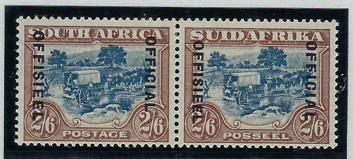 £750.00| /South Africa 1930-47 2s 6d blue brown 'Ox-wagon Inspanned' Official, rotogravure 'SUIDAFRIKA' one word, overprint type O2 horizontal pair, right (A...