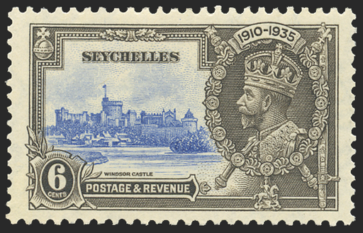 £395.00| /Seychelles 1935 Silver Jubilee 6c ultramarine and grey-black, showing variety 'Double flagstaff' from vignette plate '6', R5/2, SG128e. A fine and ...