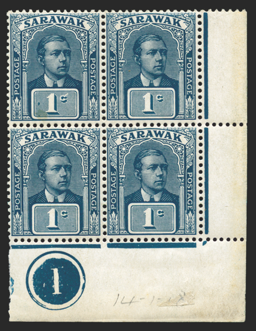 £110.00| /Sarawak 1918 1c slate-blue and slate, "Sir Charles Vyner Brooke", lower right corner block of 4 with plate number '1', SG62. This stamp issue was p...