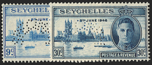 £95.00| /Seychelles 1946 Victory 9c light blue and 30c deep blue perforated 'SPECIMEN' (type D21), SG150s/1s. Fine and fresh mint examples with original gum...