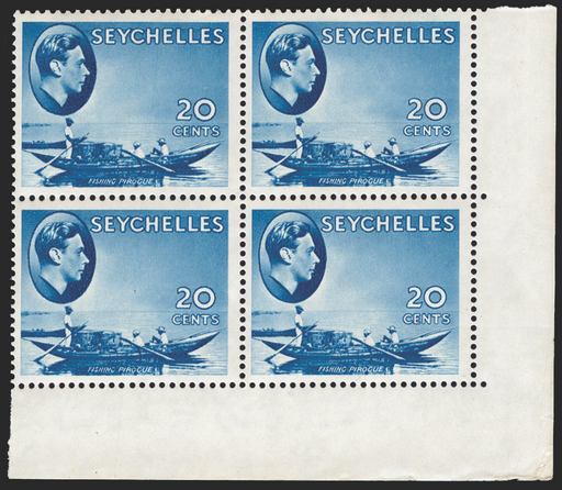 £150.00| /Seychelles 1938-49 20c blue, "Fishing Pirogue", lower right corner block of 4, SG140. A lovely fresh positional block, unmounted mint with full ori...