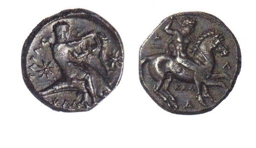£2,500.00| /Ancient Greece Silver Stater Calabria-Tarentum c 340-325 BC. Obv. Horseman riding r., brandishing spear, he holds speares and shield. Rev. Taras r...