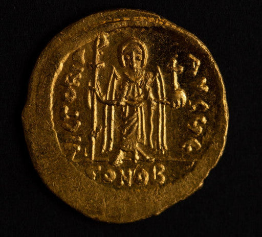 £3,000.00| /Ostrogoths Athalaric Gold Solidus in the name of Justinian I. Obv: D N IVSTINIANVS P G AVG, pearl-diademed, helmeted and cuirassed bust facing, sl...