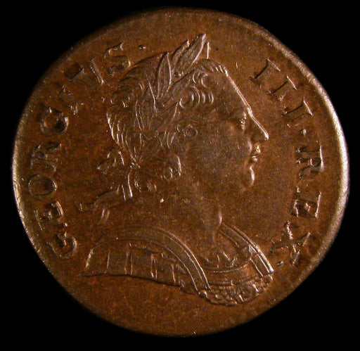 £500.00| /Halfpenny George III 1772 Reverse A. Curved Raised lines on bottom scroll of shield Uncirculated and graded 80 by London Coins Grading Service and ...