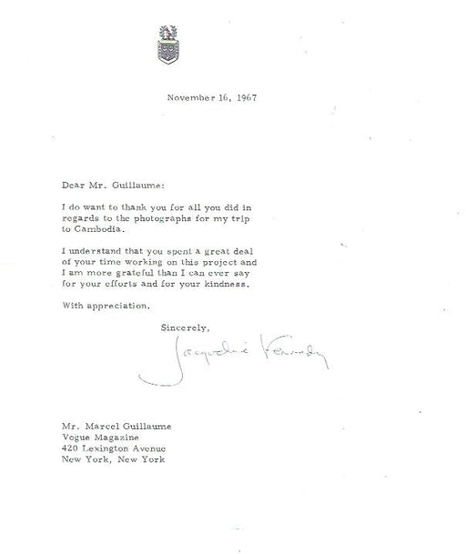 £950.00| /A 1967 signed letter from Jacqueline Kennedy A typed, one-page letter on heraldic letterhead. 6 x 9 inches. Dated November 16, 1967. Features a ...