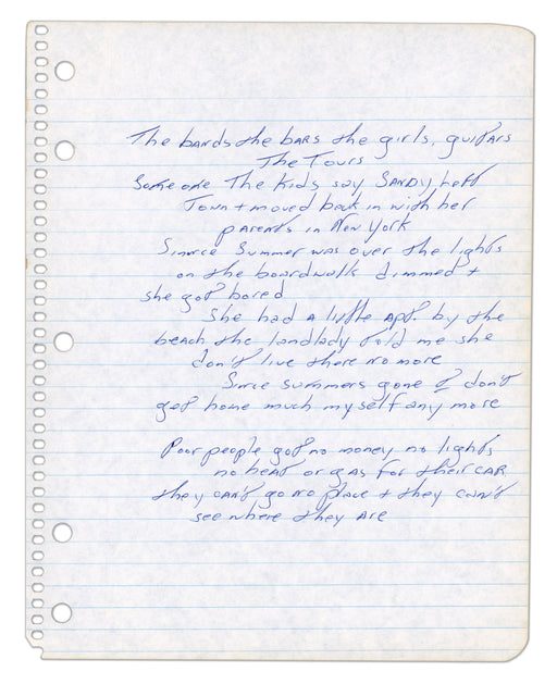 £3,500.00| /A sheet of Bruce Springsteen's handwritten lyrics to '4th of July, Asbury Park (Sandy)' Featuring an early working draft of the classic 1973 song ...