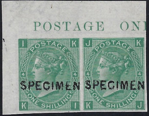 £850.00| /Great Britain 1867 1s Green Plate 4, SG117s. A very fine unmounted original gum top left hand corner marginal horizontal pair lettered K1-KJ, over...