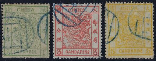 £1,400.00| /China 1883 "Candarins" thicker paper, 2 1/2mm spacing 1ca pale green, 3ca vermilion and 5ca chrome-yellow, SG7/9. The odd small imperfection but s...