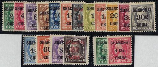 £2,500.00| /China United States Postal Agency in Shanghai 1919 surcharges set of 16 to $2 on $1 purple-black. Also includes 1922 2c on 1c blue-green and 4c on...