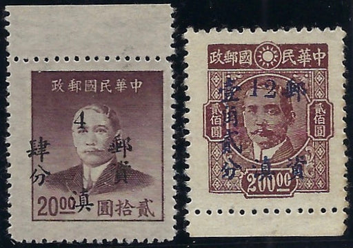 £1,000.00| /China 1949 Yunnan Province issued at Kumming, silver yuan surcharges with value in normal currency, 4c on $20 brown-purple and 12c on $200 chocol...