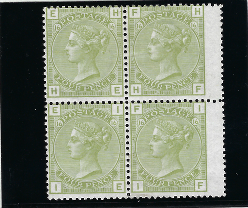 £8,750.00| /Great Britain 1877 4d Sage green Plate 16, SG153. An exceptionally fine and fresh unused original gum right hand wing marginal block of four lette...