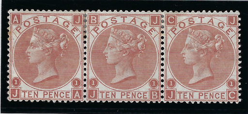 £10,800.00| /Great Britain 1867 10d pale red-brown Plate 1, SG113. A very fine unused large part original gum horizontal strip of three lettered JA-JC. Corner...