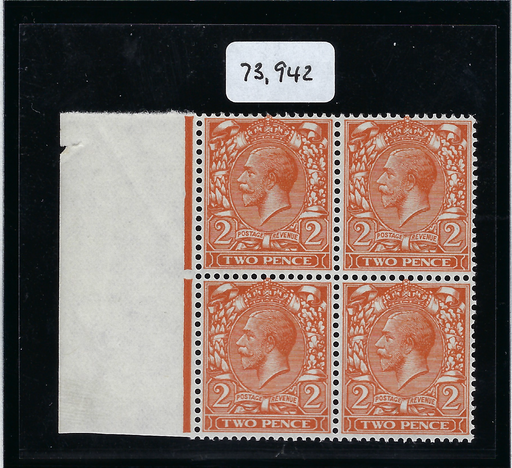 £9,000.00| /Great Britain King George V 1924 2d Orange (No Watermark), SG421a. A very fine unmounted mint full original gum left hand marginal block of four o...