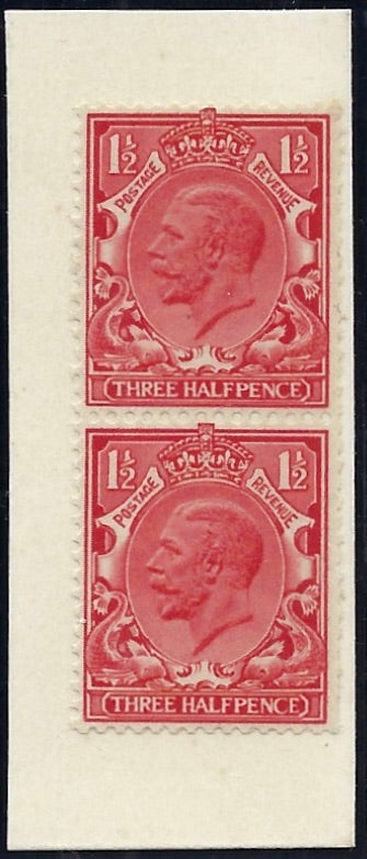 £4,400.00| /Great Britain King George V 1934 1½d 'Photogravure' essay, SG441var. Very fine vertical pair of perforated essays printed by Harrison & Sons o...