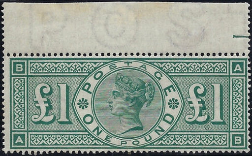 £7,750.00| /Great Britain 1891 (28.1.91) £1 Green, SG212. Very fine unmounted mint with full original gum top marginal example lettered AB. A scarce and class...