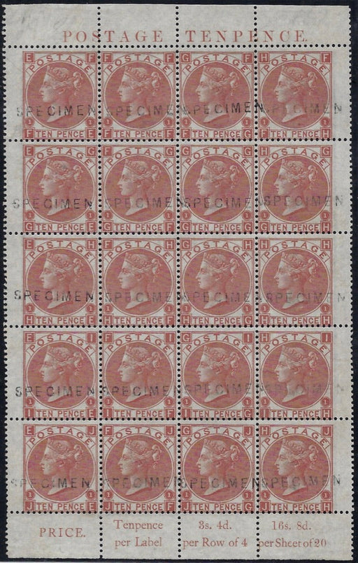 £4,250.00| /Great Britain 1878 10s Greenish grey Plate 1, SG128s. Very fine and fresh unused original gum example lettered FH. Overprinted 'SPECIMEN' type 9. ...