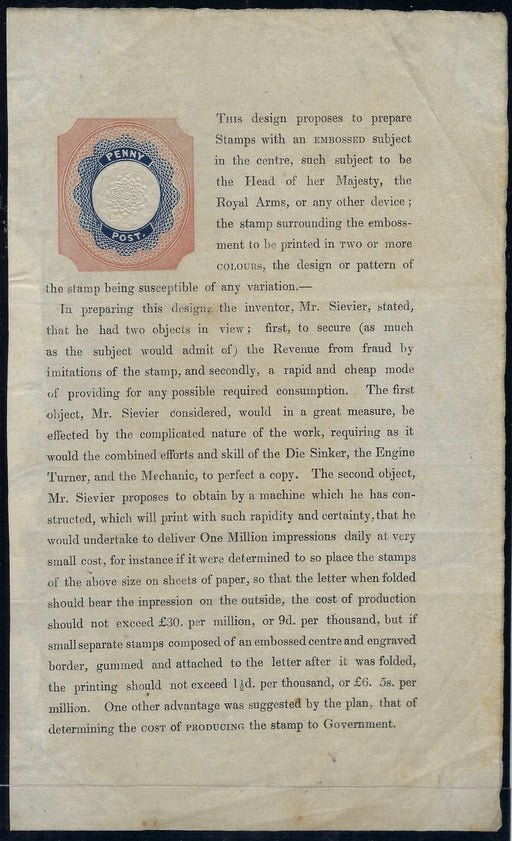 £5,500.00| /Great Britain 1840 1d Treasury competition essay by Robert Sievier. Robert W. Sievier was an engraver, and later a noted sculptor. The one illustra...