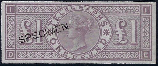 £900.00| /Great Britain 1877 £1 Telegraphs colour trial Plate 1, T17var. Very fine quality unused example with original gum, imperforate printed in dull-ma...