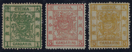 £3,500.00| /China 1878 1ca green, 3ca brown-red and 5ca orange, thin paper, 2½mm spacing, SG1/3. A fine quality mint set of the first stamp issues of the Chi...