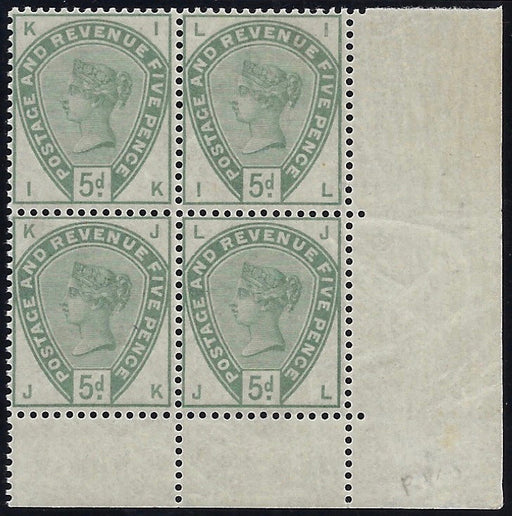 £3,000.00| /Great Britain 1884 5d Dull green, SG193. Very fine well centred unmounted mint full original gum bottom right hand corner marginal block of four l...