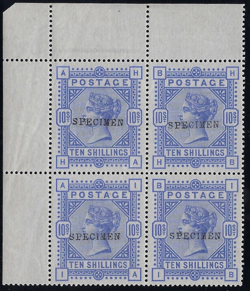 £19,000.00| /Great Britain 1884 10s Cobalt (white paper), SG182s. A superb unmounted mint full original gum top left hand marginal block of four lettered HA-IB...