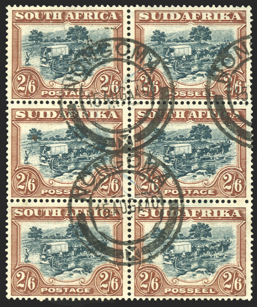£275.00| /South Africa 1930-45 2s6d (slate-) green and brown "Ox-wagon Inspanned', Rotogravure printing, 'SUIDAFRIKA' one word, upright watermark, block of 6...