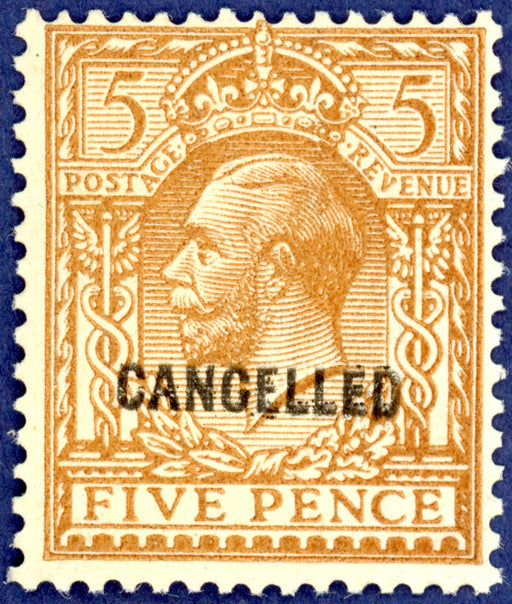 £550.00| /Great Britain 1924 5d brown, SG425var. A very fine unused example, with original gum, overprinted "CANCELLED" type 33. A very scarce King George V ...