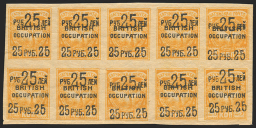 £325.00| /Batum British Occupation 1920 (1 Apr) 25r on 25k orange-yellow, type 7 surcharge in black, block of 10 (5x2) showing transfer types DEFDE/ABCAB, SG...