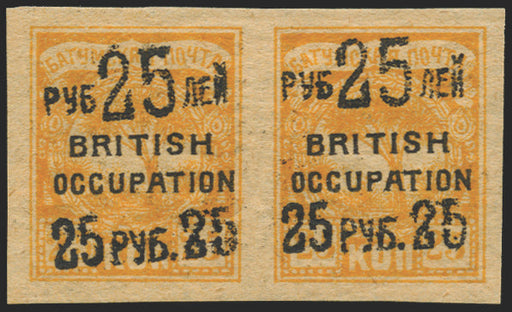 £80.00| /Batum British Occupation 1920 (1 Apr) 25r on 25k orange-yellow, type 7 surcharge in black, horizontal pair (transfer types DE), SG43. A fine mint p...