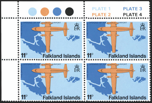£225.00| /Falkland Islands 1979 'Airport' 11p, variety 'Watermark crown to LEFT of CA' (from back), upper left corner block of 4 with colour dots and plate n...