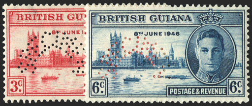 £75.00| /British Guiana 1946 Victory 3c carmine and 6c blue, perforated 'SPECIMEN' (type D21), SG302s/1s. Fine mint examples with large part original gum. T...