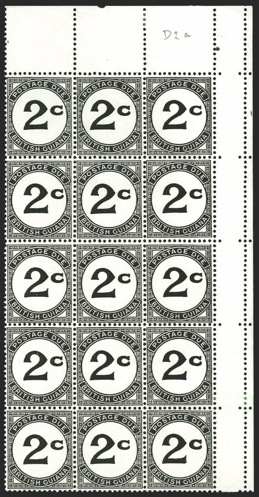 £500.00| /British Guiana 1940-55 2c black Postage Dues, chalk-surfaced paper, upper right corner block of 15 (3x5) showing watermark error W9a 'Missing crown...